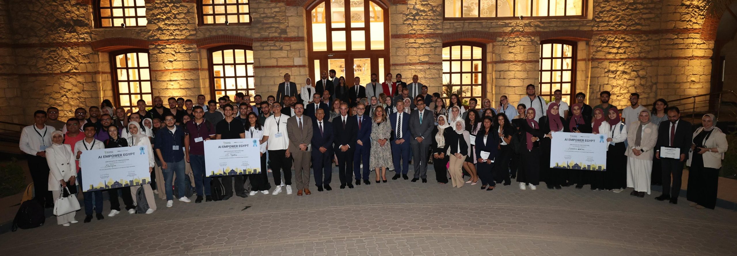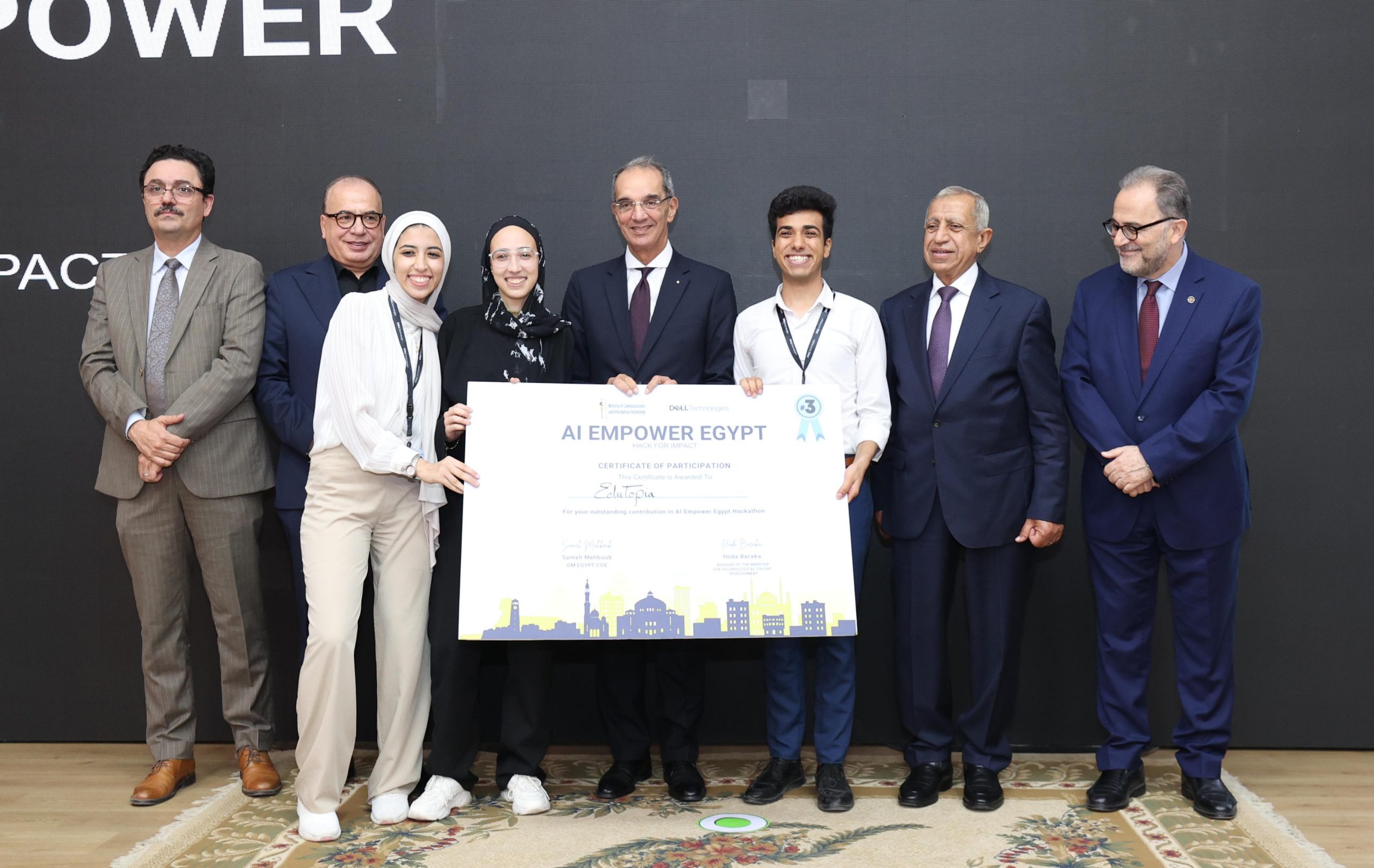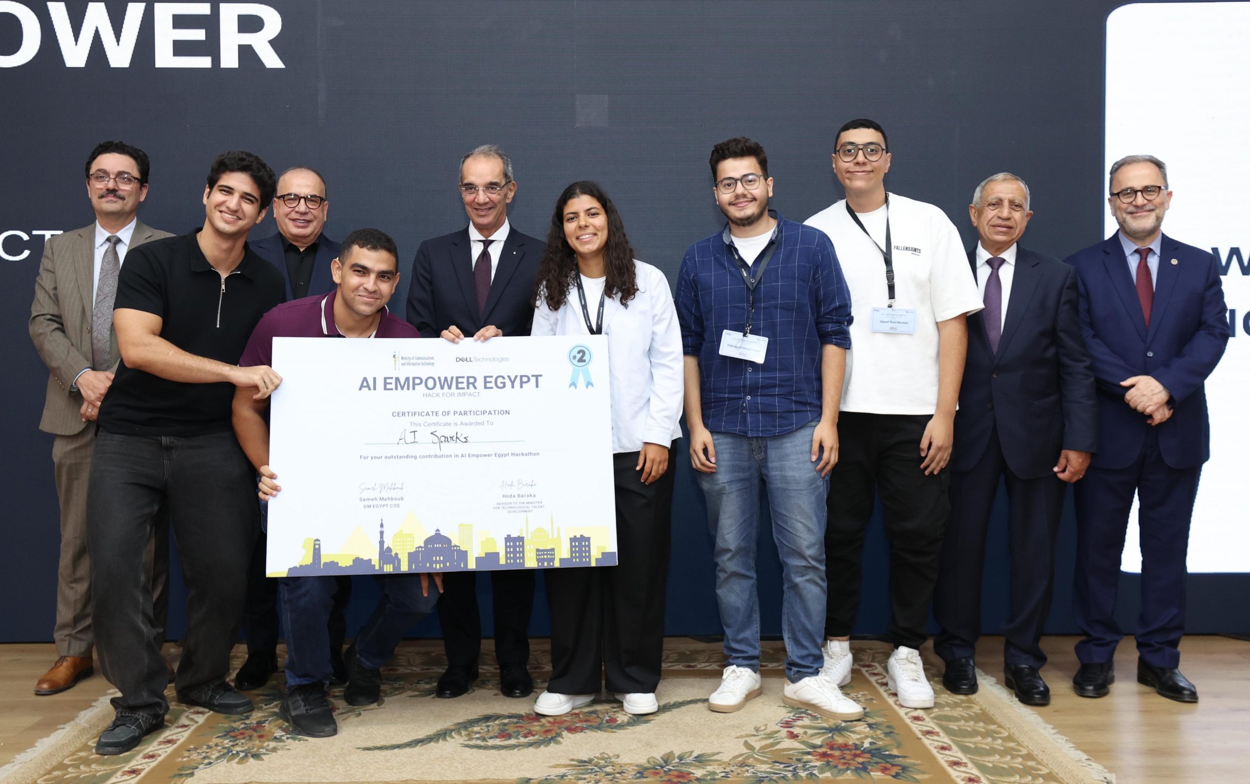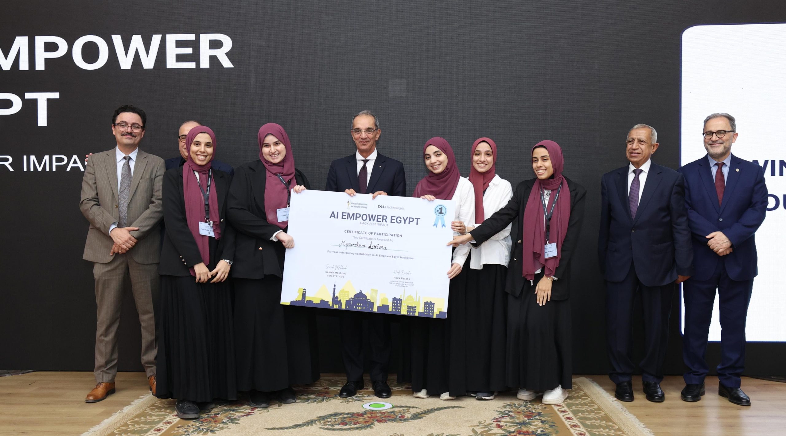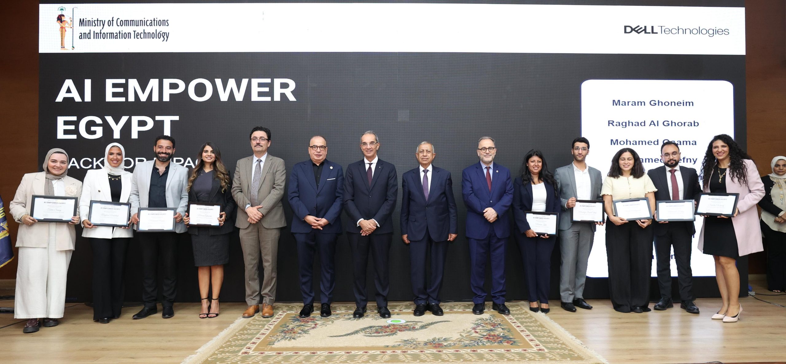 حضر ختام فعاليات الدورة الثالثة من مبادرة بناء القدرات للجامعات فى مجال الذكاء الاصطناعى؛ المهندسة/ غادة لبيب نائب وزير الاتصالات وتكنولوجيا المعلومات للتطوير المؤسسى، والسيد/ سامح محبوب مدير عام مركز تميز شركة دل تكنولوجيز، والدكتور/اسماعيل عبد الغفار رئيس الأكاديمية العربية للعلوم والتكنولوجيا والنقل البحرى، والمهندس/ أحمد الظاهر الرئيس التنفيذى لهيئة تنمية صناعة تكنولوجيا المعلومات (ايتيدا)، والدكتورة/ هدى بركة مستشار وزير الاتصالات وتكنولوجيا المعلومات لتنمية المهارات التكنولوجية، والدكتور/ أحمد طنطاوى المشرف على أعمال مركز الابتكار التطبيقى، والدكتور/ أحمد خطاب مدير المعهد القومى للاتصالات، والدكتور/ عبد المنعم الشرقاوى رئيس الأكاديمية الوطنية لتكنولوجيا المعلومات للأشخاص ذوى الإعاقة، والدكتور/ أحمد صبحى دلال رئيس الجامعة الأمريكية بالقاهرة، والمهندس/ إيهاب عبد الحميد مدير عام نظم المعلومات والتحول الرقمى بديوان عام وزارة السياحة والاثار.