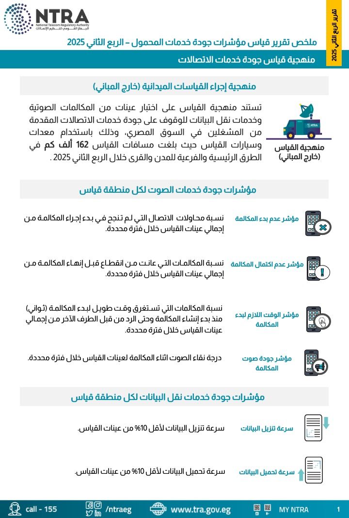 وتستند منهجية القياس به على اختبار عينات من المكالمات الصوتية وخدمات نقل البيانات للوقوف على جودة خدمات الاتصالات المقدمة من المشغلين في السوق المصري، وذلك باستخدام معدات وسيارات القياس، وبلغت مسافات القياس 162 ألف كم في الطرق الرئيسية والفرعية للمدن والقرى خلال الربع الثاني لعام 2025.