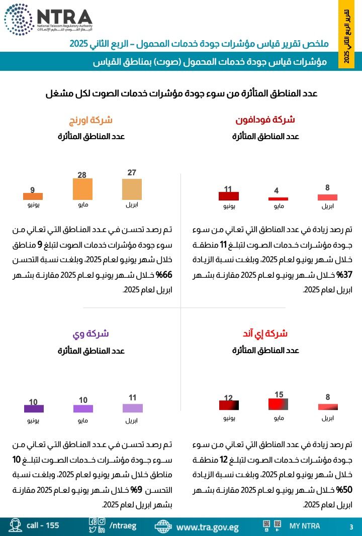 • فودافون: من أصل 121 منطقة (مدينة وحي) تم إجراء اختبارات القياس عليها، تم رصد زيادة في عدد المناطق التي تعاني من سوء جودة مؤشرات خدمات الصوت لتبلغ 11 منطقة خلال شهر يونيو لعام 2025، وبلغت نسبة الزيادة 37% خلال شهر يونيو لعام 2025 مقارنة بشهر أبريل لعام 2025.