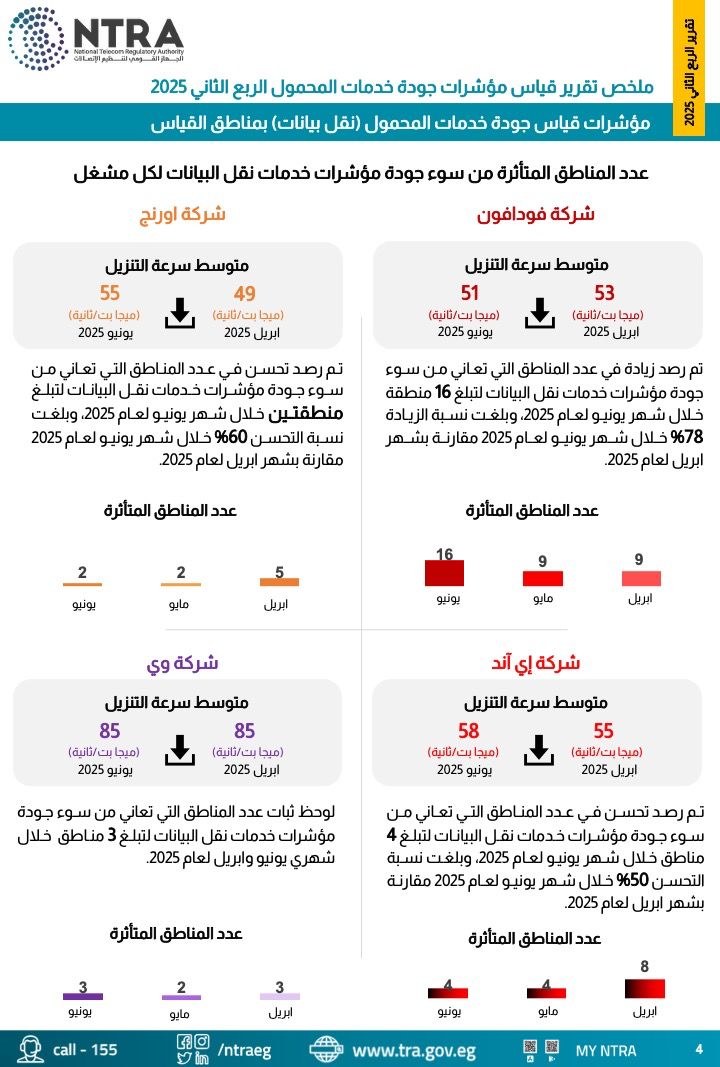 • فودافون: من أصل 121 منطقة (مدينة وحي) تم إجراء اختبارات القياس عليها، تم رصد زيادة في عدد المناطق التي تعاني من سوء جودة مؤشرات خدمات نقل البيانات لتبلغ 16 منطقة خلال شهر يونيو لعام 2025، وبلغت نسبة الزيادة 78% خلال شهر يونيو لعام 2025 مقارنًة بشهر أبريل لعام 2025، وتم رصد انخفاض في متوسط سرعة تنزيل البيانات لشركة فودافون خلال شهر يونيو لعام 2025 ليصبح 51 ميجابت/ثانية بدلًا من 53 ميجابت/ثانية بشهر أبريل لعام 2025.