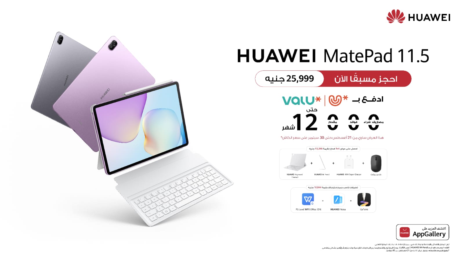 بالتزامن مع فتح باب الطلب المسبق لجهاز HUAWEI MatePad 11.5 الجديد في مصر، تقدم هواوي عرضًا استثنائيًا يتيح لك دفع كاش أو عن طريق ڤاليو بدون أي مصاريف شراء أو مقدم أو فوائد، ولمدة تصل إلى 12 شهرًا. ويبلغ سعر الجهاز 25,999 جنيه مصري، ويأتي العرض ساريًا من 21 أغسطس حتى 30 سبتمبر.