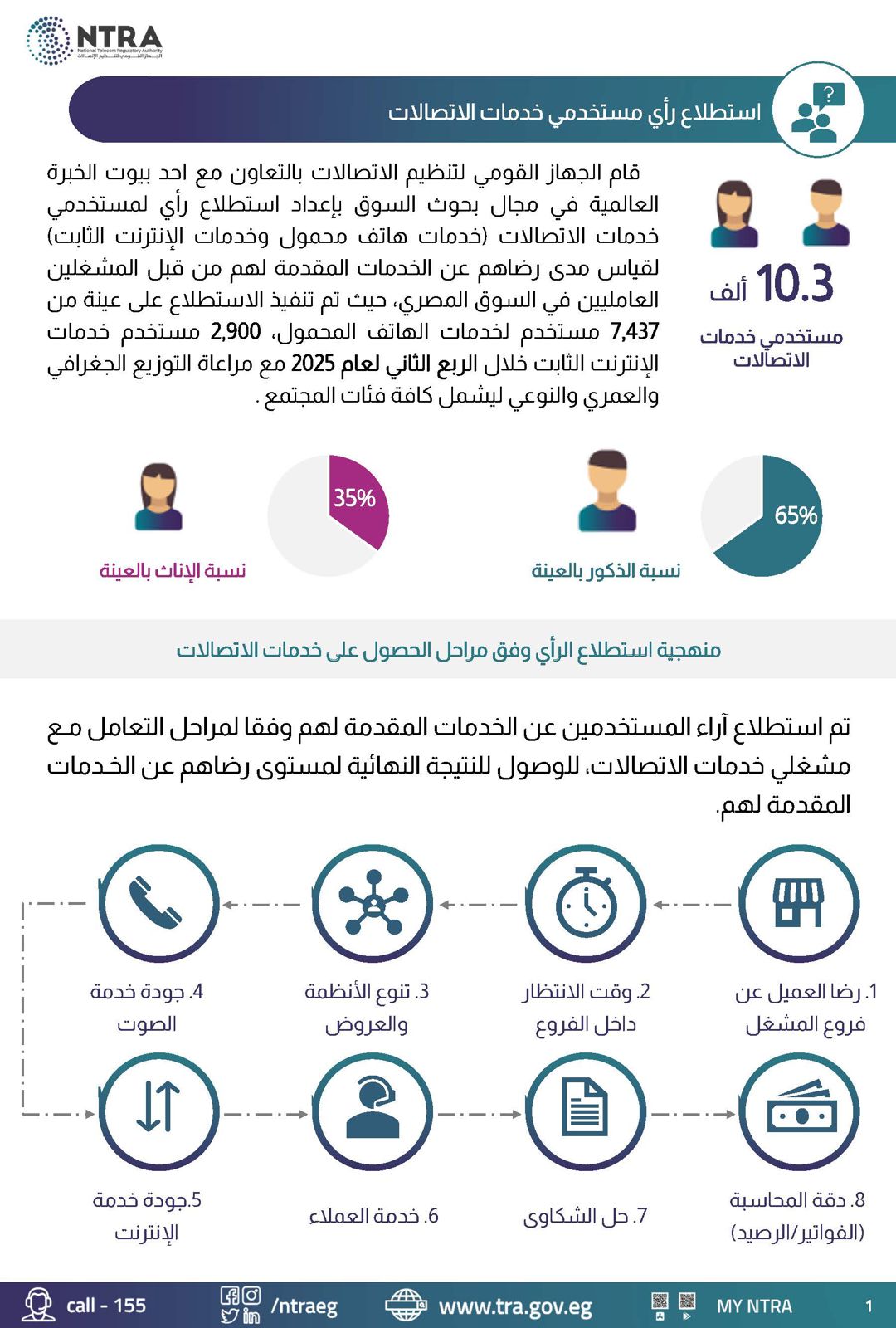 وفيما يلي انفجراف حول استطلاع رأي مستخدمي خدمات الاتصالات عن خدمات الهاتف المحمول وخدمات الإنترنت الثابت في السوق المصري للربع الثاني لعام 2025