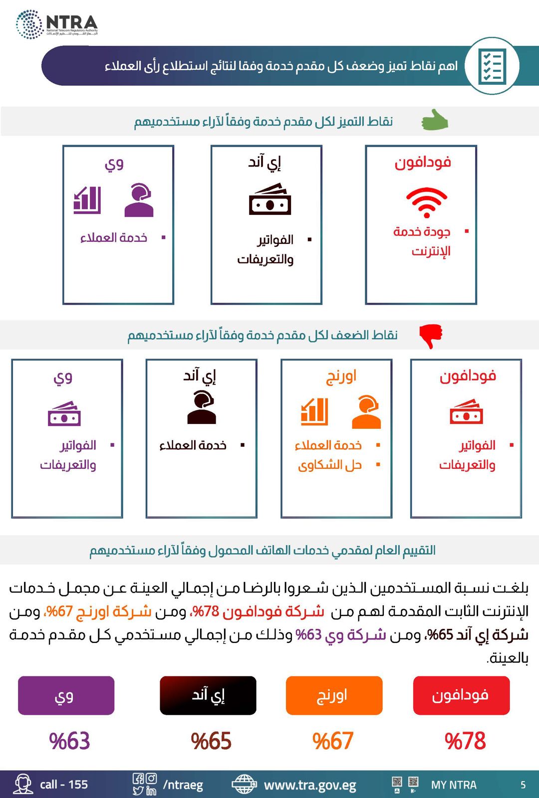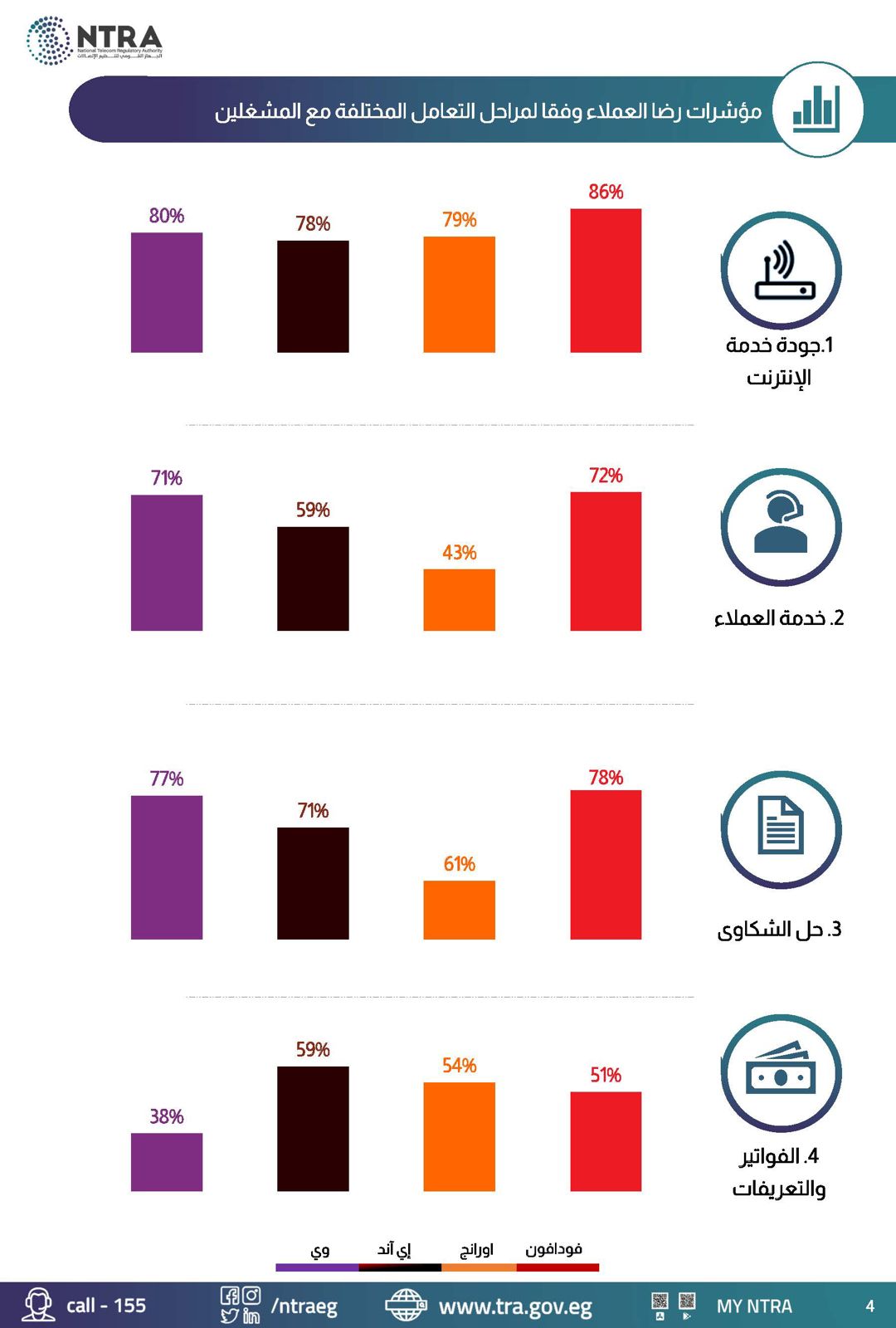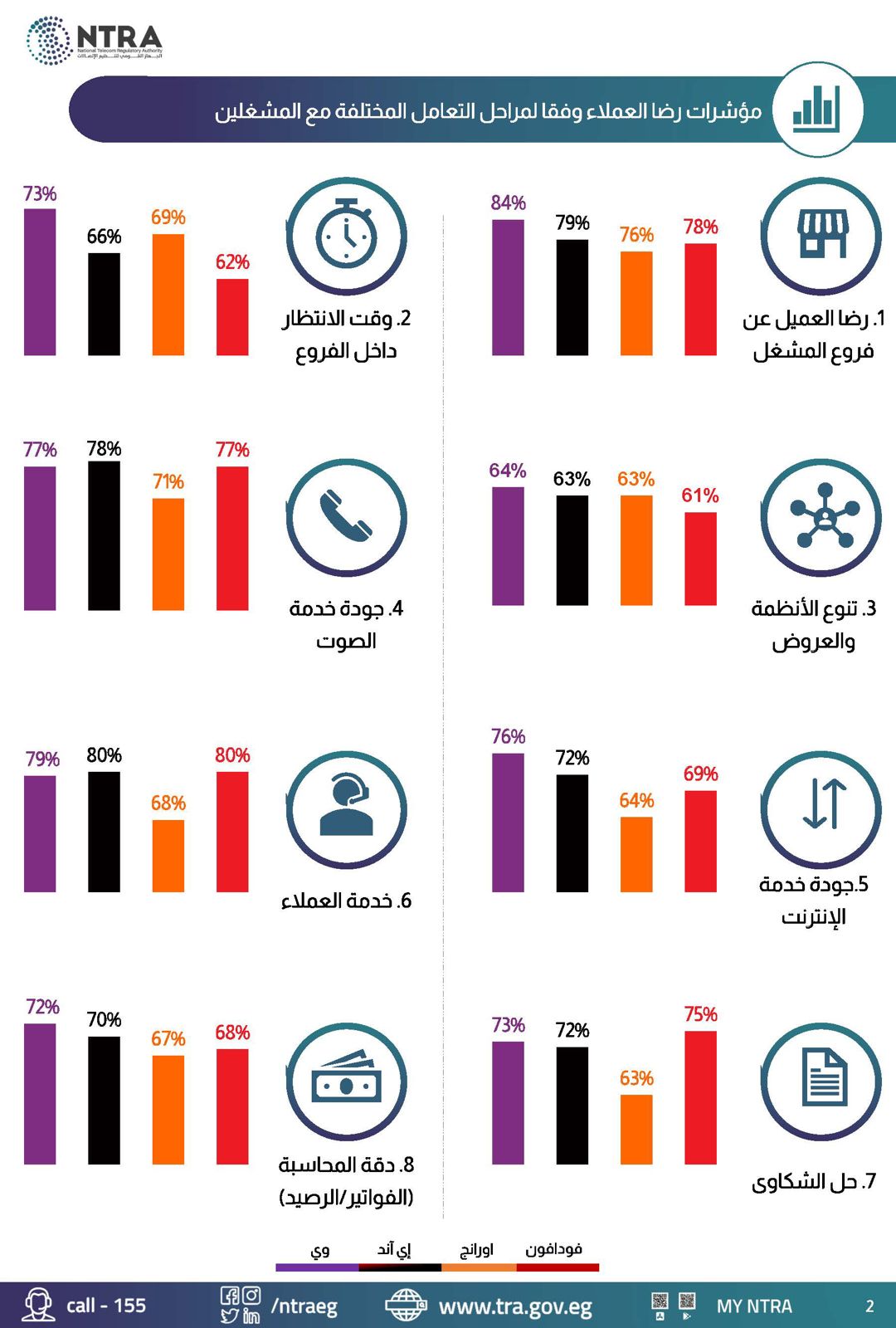 • جودة خدمة الإنترنت: حصلت شركة فودافون على نسبة 86% بمؤشر جودة خدمة الإنترنت، تليها شركة وي بنسبة 80%، وشركة اورنج بنسبة 79%، وشركة إي آند بنسبة 78%.
