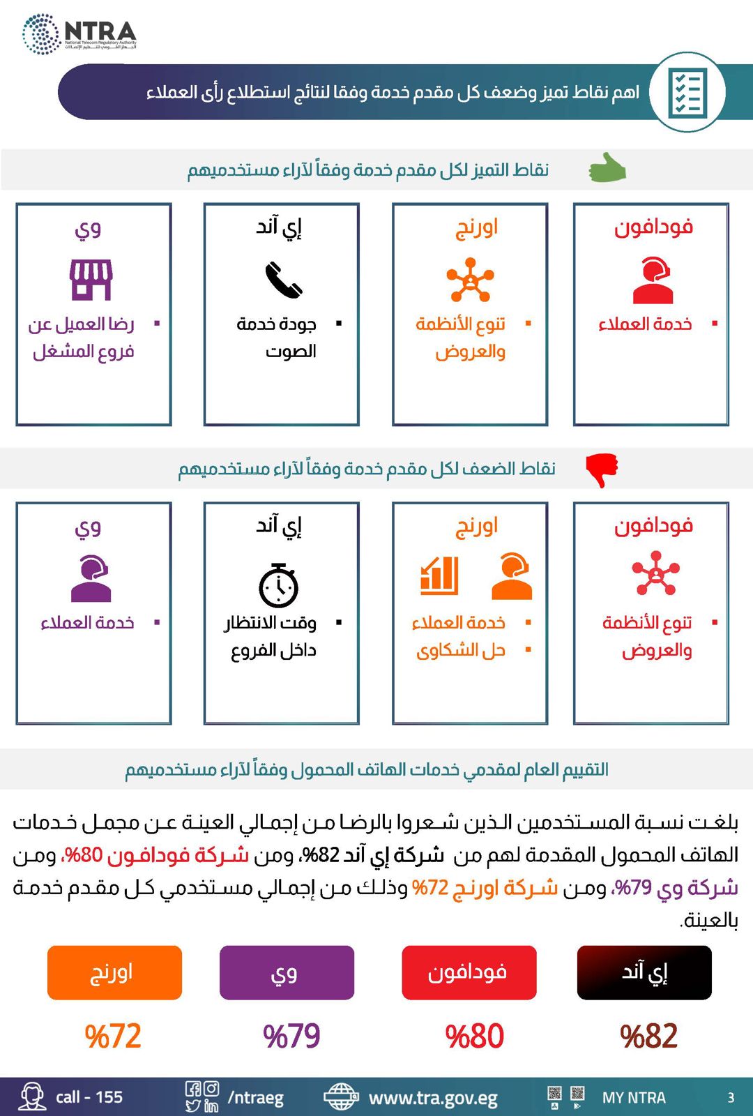 بلغت نسبة المستخدمين الذين شعروا بالرضا من إجمالي العينة عن مجمل خدمات الهاتف المحمول المقدمة لهم من شركة إي آند 82%، ومن شركة فودافون 80%، ومن شركة وي 79%، ومن شركة اورنج 72% وذلك من إجمالي مستخدمي كل مقدم خدمة/شركة بالعينة.