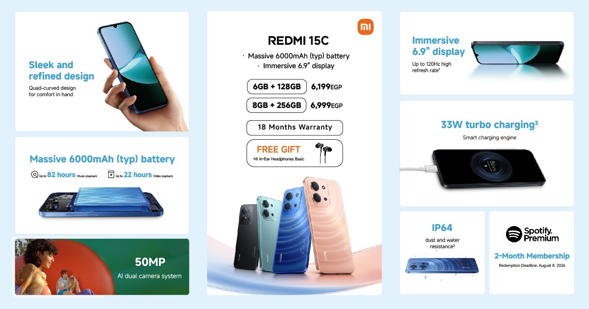 أعلنت شركة شاومي عن طرح هاتفها الذكي الجديد Redmi 15C في السوق المصرية، في خطوة تعزز حضورها القوي في فئة الهواتف متوسطة السعر، مع تقديم مزيج متوازن من الأداء القوي، البطارية العملاقة، والتصميم العصري، لتلبية احتياجات المستخدمين المتنوعين من الشباب والطلاب إلى عشاق الترفيه والعمل على حد سواء.
