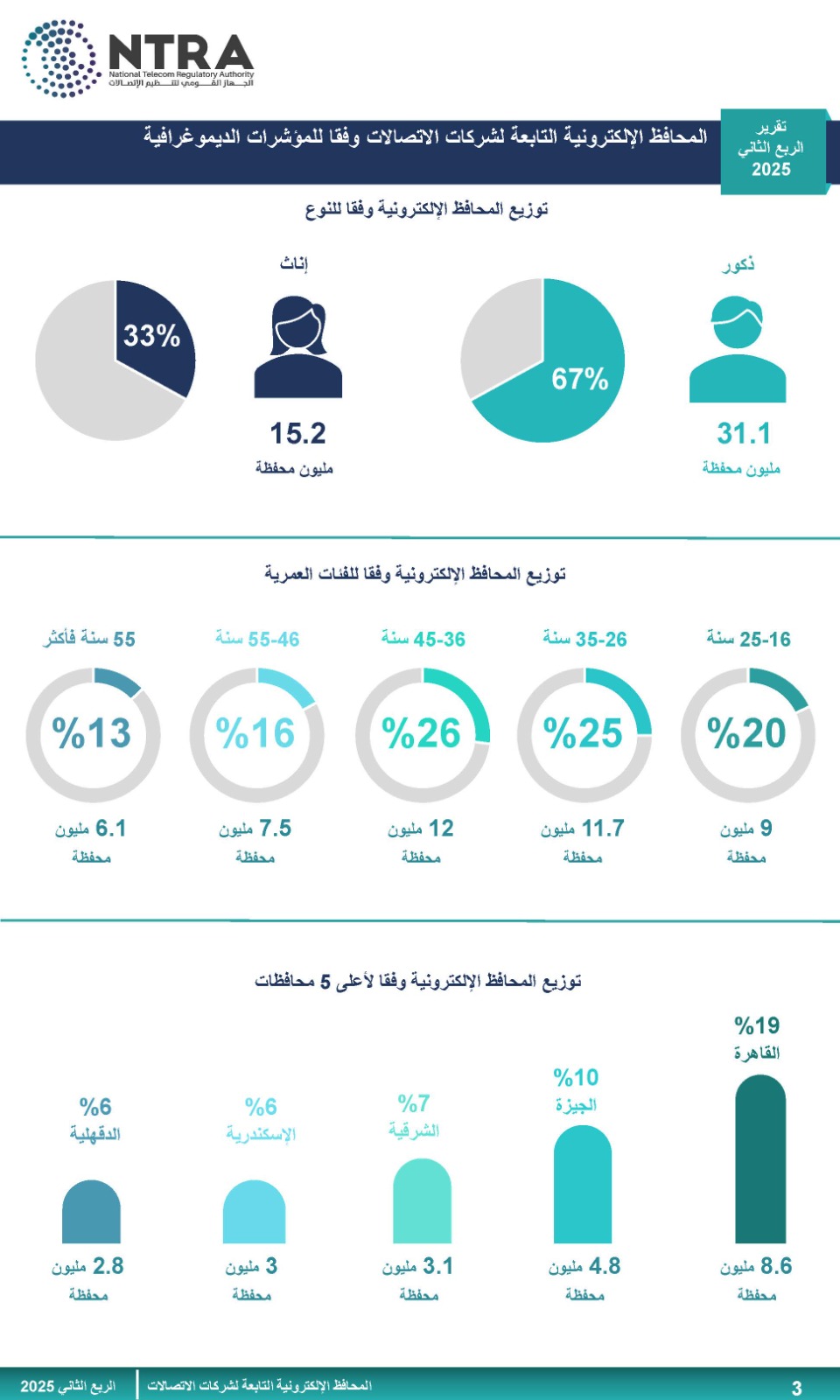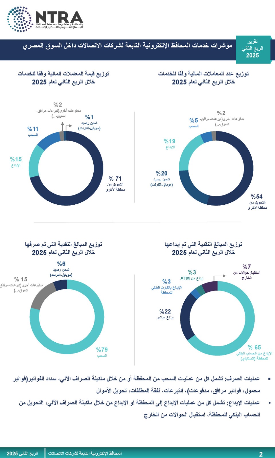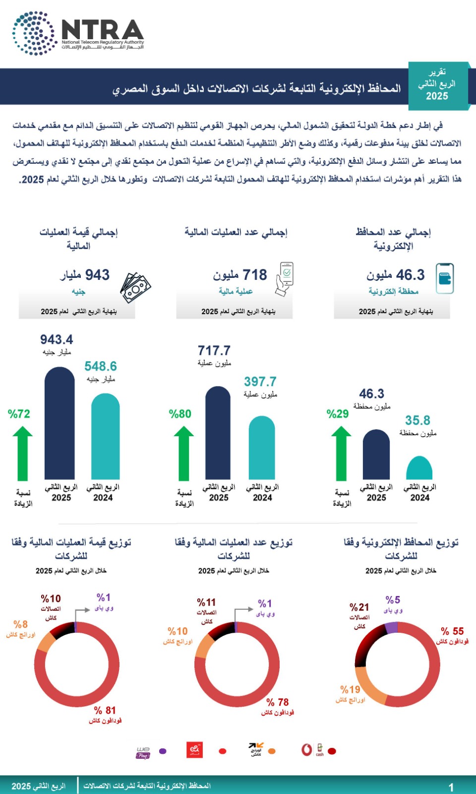 ومن منطلق حرص الجهاز القومي لتنظيم الاتصالات على رفع الوعي لدى المستخدمين بوسائل الدفع الإلكترونية، فقد أصدر الجهاز تقرير الربع الثاني لعام 2025 (الفترة من أبريل إلى يونيو 2025) الخاص بمؤشرات استخدام المحافظ الإلكترونية التابعة لشركات الاتصالات.