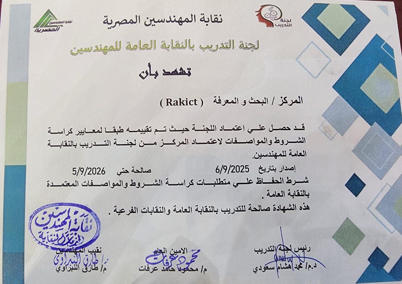في خطوة جديدة تعكس ثقة المؤسسات المهنية في قدراتها التدريبية وريادتها في مجالات التكنولوجيا الحديثة، حصل مركز البحث والمعرفة (RAKICT) على اعتماد رسمي من نقابة المهندسين المصرية كمركز تدريب معتمد، بعد استيفائه جميع المعايير والشروط التي وضعتها لجنة التدريب بالنقابة. ويعد هذا الاعتماد إضافة مهمة لرصيد المركز في إعداد وتأهيل الكوادر الهندسية والتقنية وفق أحدث المناهج وأعلى معايير الجودة.