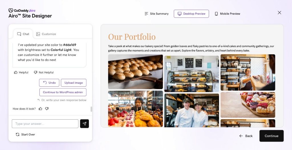 يمكن ل GoDaddy Airo Site Designer أن ينشئ موقع WordPress مخصص كامل، مكتمل بالكلمات والصور والتخطيط بعد أن يتم تقديم وصف موجز لفكرة العمل.
