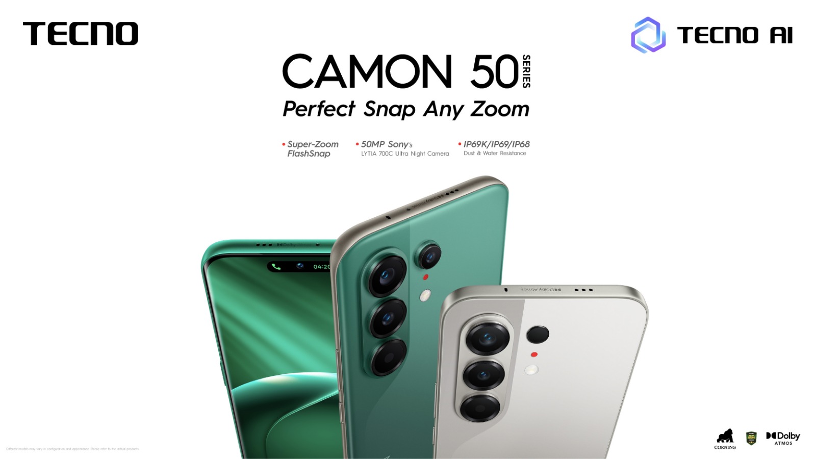 ويقدم CAMON 50 Ultra 5G أداءً موثوقاً بفضل معالج MediaTek Dimensity 7400 Ultimate . كما تتميز جميع هواتف السلسلة بشاشة AMOLED فائقة السطوع بدقة 1.5K ومعدل تحديث 144 هرتز لتجربة بصرية سلسة للغاية. وتأتي السلسلة أيضاً بمعايير مقاومة عالية للماء والغبار IP68 وIP69 وIP69K. كما تدعم بطارية تدوم حتى 5 سنوات بسعة تصل إلى 6500 مللي أمبير (حسب السوق) مع تقنية الشحن السريع 45 واط. أما للمستخدمين الذين يحتاجون إلى الاتصال في الأماكن النائية، فتتيح تقنية FreeLink إجراء المكالمات وإرسال الرسائل عبر البلوتوث طويل المدى دون الحاجة إلى شبكة.