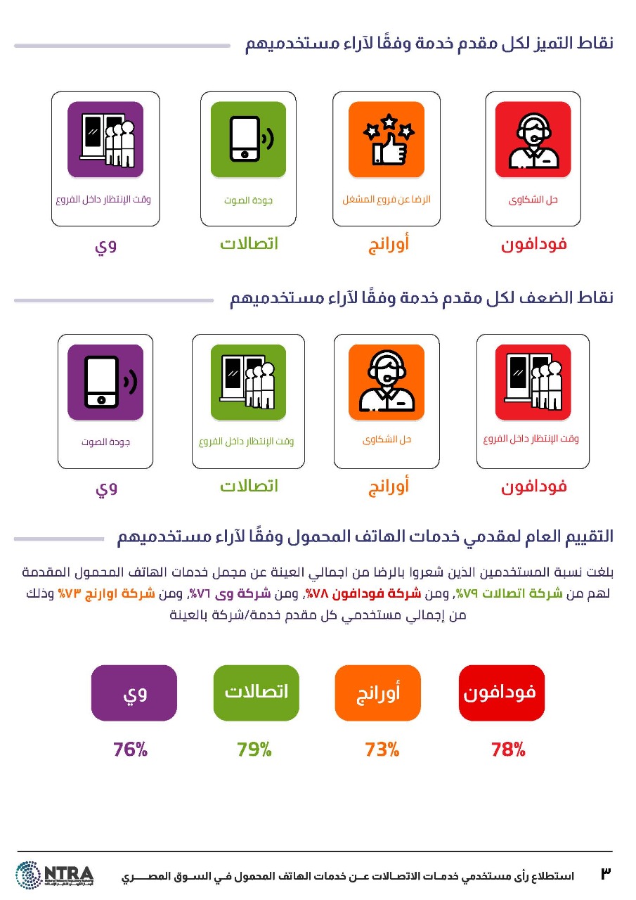 • حل الشكاوى: حصلت شركة فودافون على نسبة 71% بمؤشر حل الشكاوى تليها شركة وي بنسبة 70% وشركة اتصالات بنسبة 65% وشركة أورانج بنسبة 57%.