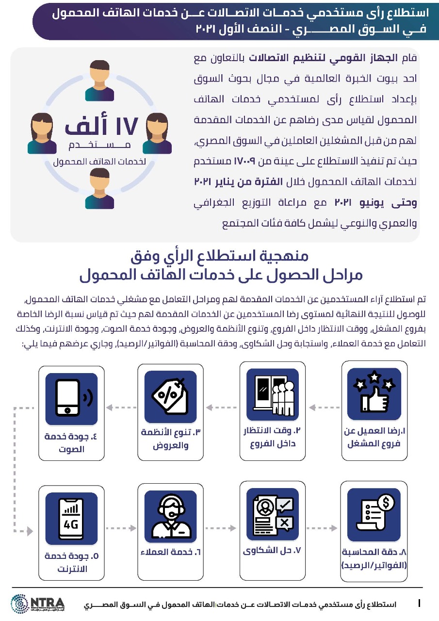 أصدر الجهاز القومي لتنظيم الاتصالات تقرير النصف الأول لعام 2021 (الفترة من يناير إلى يونيو 2021)، والخاص باستطلاع رأي مستخدمي خدمات الهاتف المحمول للوقوف على مدى رضاهم عن الخدمات المقدمة لهم من قبل المشغلين العاملين في السوق المصري، وذلك بالتعاون مع أحد بيوت الخبرة العالمية في مجال بحوث السوق، حيث تم تنفيذ الاستطلاع على عينة من 17,009 مستخدم لخدمات الهاتف المحمول مع مراعاة التوزيع الجغرافي والعمري والنوعي ليشمل كافة فئات المجتمع.